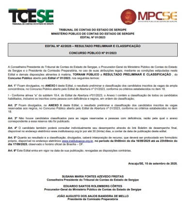 MPC-SE divulga resultado preliminar do concurso para subprocurador