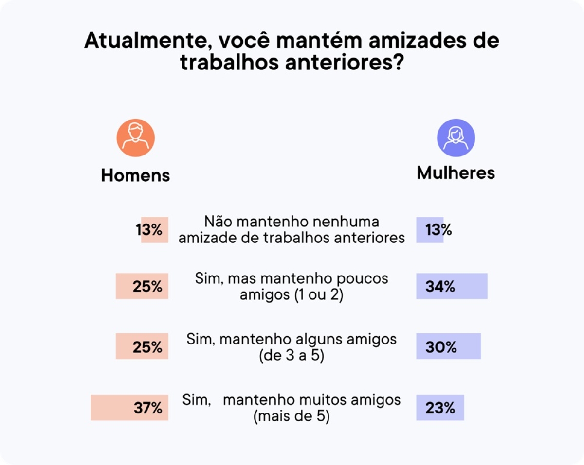Já as mulheres, parecem seguir a lógica dos “poucos e bons”, pois 34% responderam que seguem com poucas amizades de trabalhos antigos, permanecendo com uma ou duas, porcentagem que cai para 25% quando em relação aos homens.