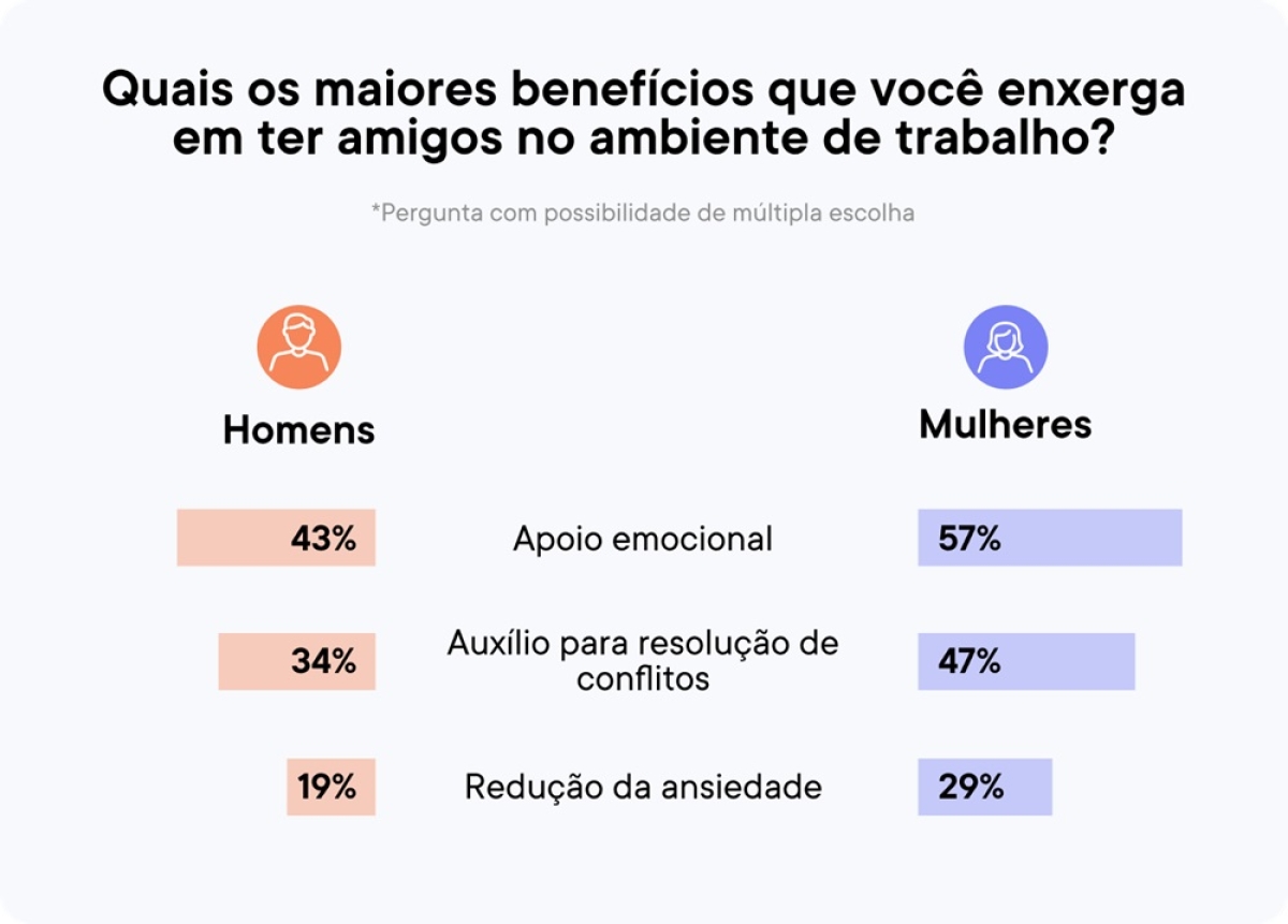 No ambiente de trabalho, espaço onde também se criam laços de amizade, é possível perceber e analisar algumas das particularidades dessas relações. Mesmo no âmbito profissional, os pilares das amizades para as mulheres e para os homens são diferentes, é o que mostra uma pesquisa da Onlinecurriculo, plataforma de currículos online. Enquanto para 57% das mulheres o maior benefício de se ter amigos no trabalho é o apoio emocional, esse número cai para 43% para os homens.