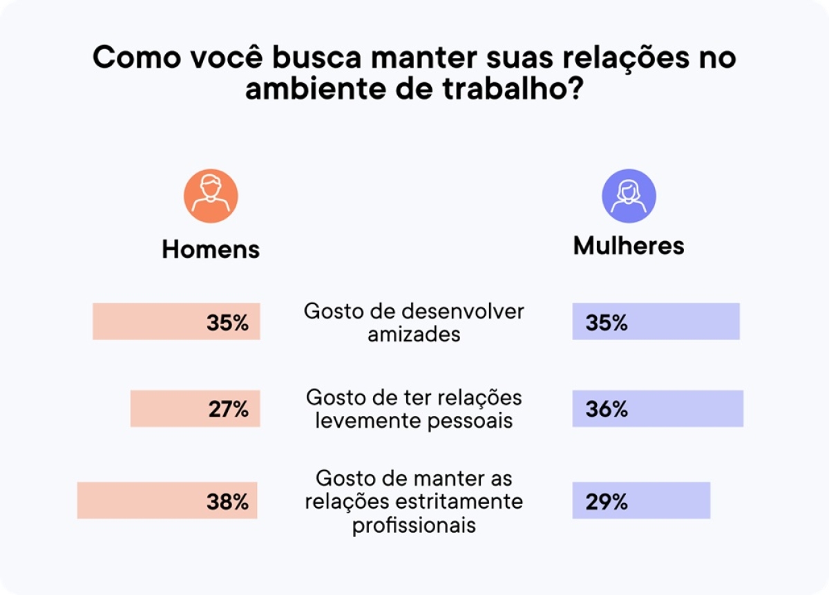 Mesmo que homens e mulheres gostem de desenvolver amizades no trabalho em igual porcentagem (35%), de forma geral, 38% dos homens disseram que tendem a manter relações de forma estritamente profissional, enquanto 29% das mulheres preferem as relações dessa forma. Por outro lado, quando se fala de desenvolver as relações de forma levemente pessoal, mulheres aparecem com maior porcentagem (36%) se comparadas com os homens (27%).