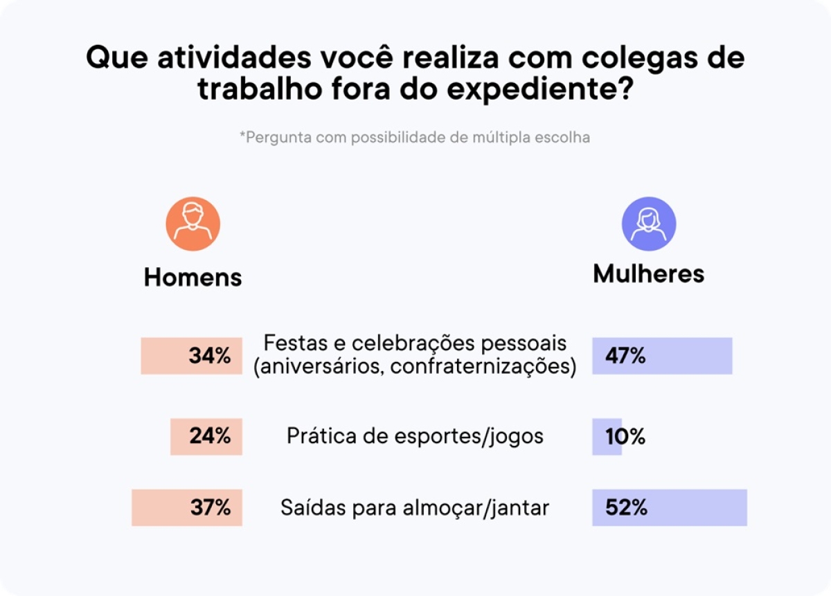 Mulheres parecem investir mais nas atividades com os amigos fora do trabalho. Entre as programações preferidas, aparecem saídas para almoços e jantares, indicado por 57% das entrevistadas, enquanto os números caem 37% para os homens. Festas e celebrações pessoais também são mais comuns entre mulheres (47%) do que entre homens (34%).