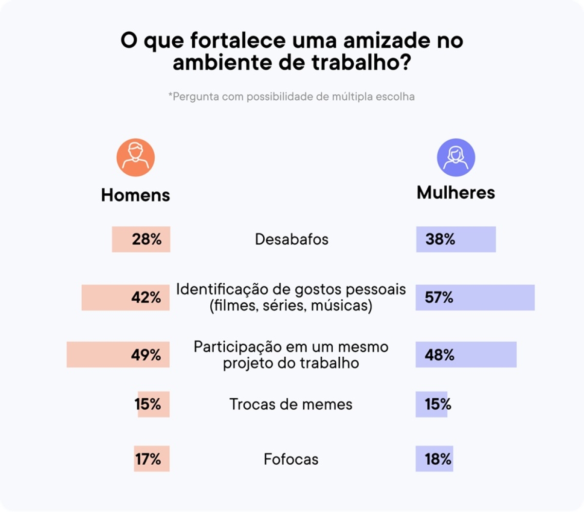 “É interessante perceber que algumas respostas realmente validam certos estereótipos de gênero, especialmente quando se fala em pontos mais emocionais, como os desabafos. Essas trocas profundas são conhecidas por marcar as amizades femininas. Dito isso, existem certos assuntos que são claramente universais, como as fofocas e os memes, que com certeza aproximam as pessoas e que também podem trazer leveza para as relações - especialmente no trabalho", comenta Augustine.