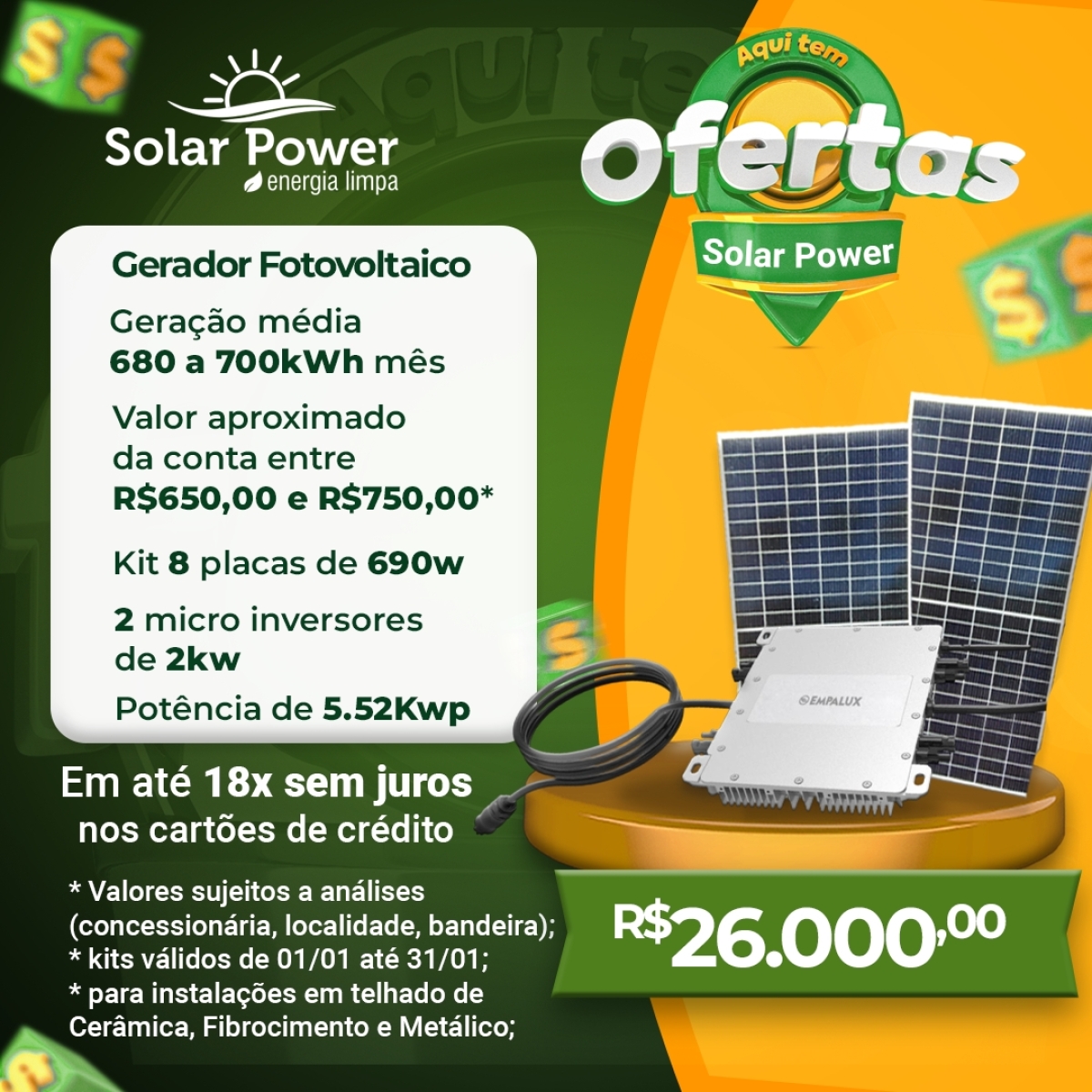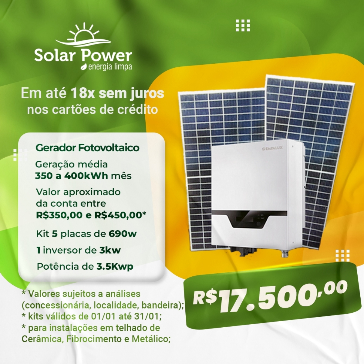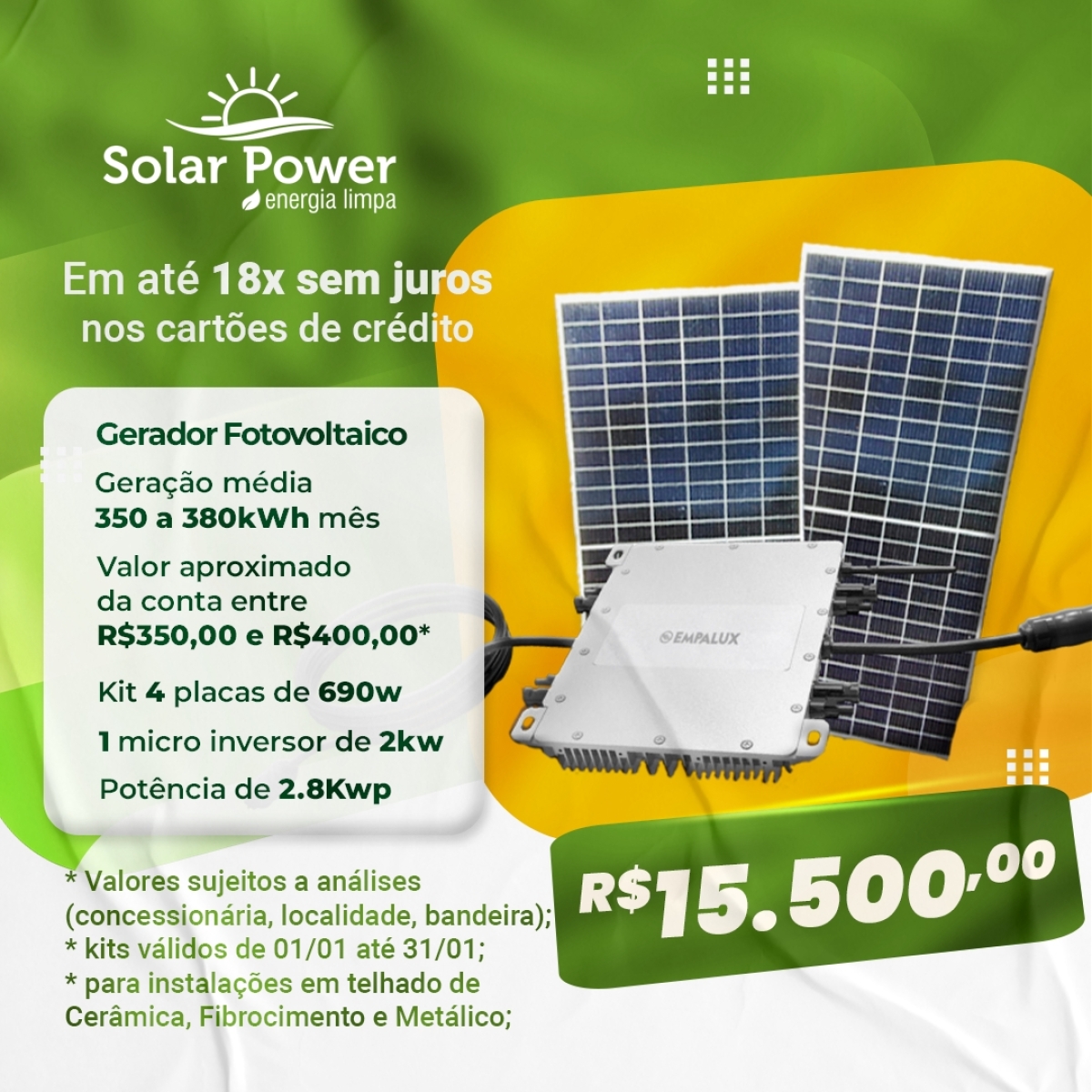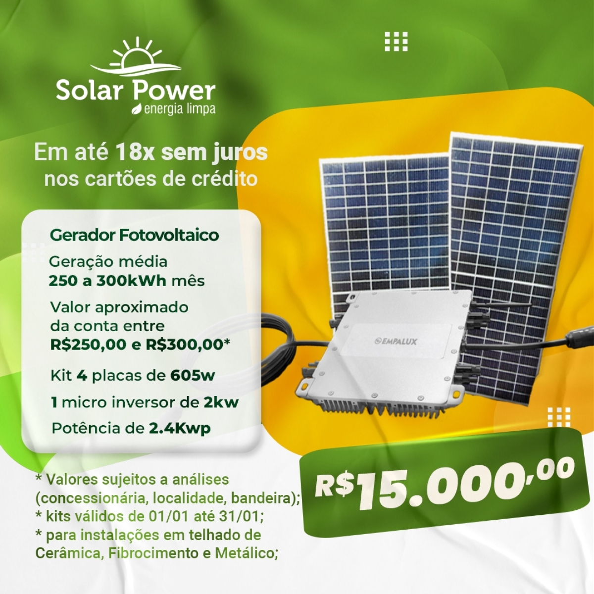 Solar Power - Energia Limpa em até 18x sem juros nos cartões de crédito; confira kWh e R$