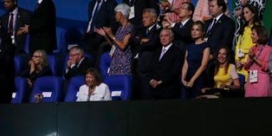 Carlos Arthur Nuzman para discurso por causa de manifestações do público e Michel Temer recebe vaias